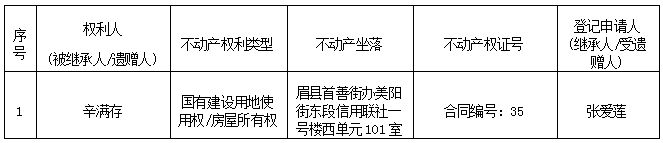 根據《不動產登記暫行條例實施細則》第十四條的規定,經初步查驗,不動產登記機構擬對下列不動產權利辦理不動產繼承登記。根據《不動產登記暫行條例實施細則》第十七條的規定,現予公告。如有異議,請自本公告之日起 30 日內,將異議書面材料送達不動產登記機構。逾期無人提出異議或者異議不成立的,不動產登記機構將予以登記。